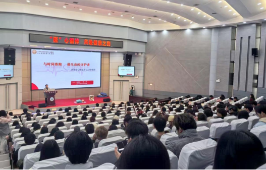 医院急救中心胡芳护士长通过心血管疾病数据(院外心脏骤停抢救成功率仅4.5%)强调急救时效性,现场演示CPR与AED操作,由急诊团队为同学们带来了模拟校园突发心脏骤停事件小短剧,让大家现场学习急救的正确方法。随后,曹晶护士以“为爱守护”为主题,系统讲解女性生理构造、常见女性疾病预防及健康管理知识,倡导建立科学健康的生活方式。郑蕾医生解析皮肤科学,针对老员工群体高发的敏感肌、痘痘肌问题,提出“精简护肤”解决方案,提倡“适度清洁+精准护理+自我接纳”的三维护肤理念。