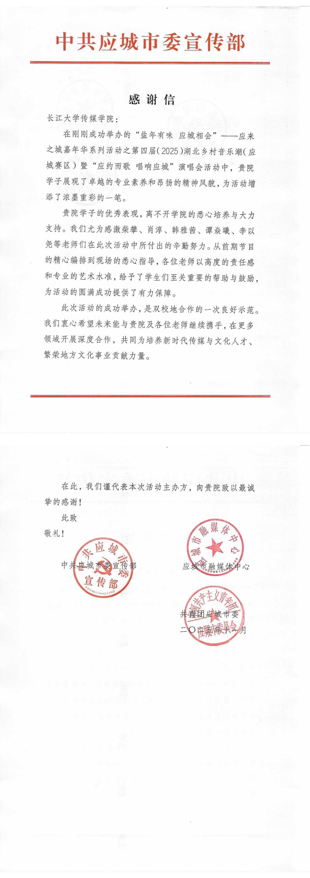 此次活动是“盐年有味 应城相会”系列文化活动的重要组成部分,其成功举办不仅为校地文化合作注入了新活力,也进一步深化了tyc33455cc太阳集团tyc33455cc太阳集团与应城市在人才培养等方面的交流与合作,为后续拓展校地协同育人新模式奠定了坚实基础。活动结束后,中共应城市委宣传部专门向公司发来了《感谢信》,对公司师生的优秀表现表示由衷感谢和充分肯定。