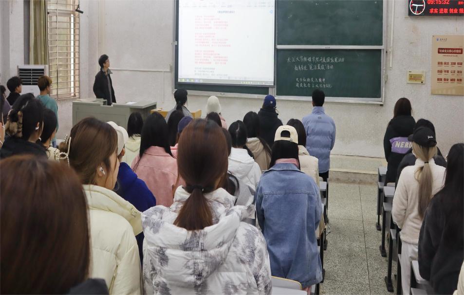 活动伊始,12月4日上午全体同学肃然起立,在张文熙老师的带领下唱响《宪法伴我成长》。正如里歌词中说的那样“乘着宪法的翅膀,我们一同飞翔。”宪法是国家的根本法,是治国安邦的总章程,身为新时代的青年人更应该以法为则,传承着星星火炬,为祖国注入新鲜的力量。在一声声坚定亦希望的歌声里,同学们的学习热情被活跃带动,本次活动正式拉开帷幕。