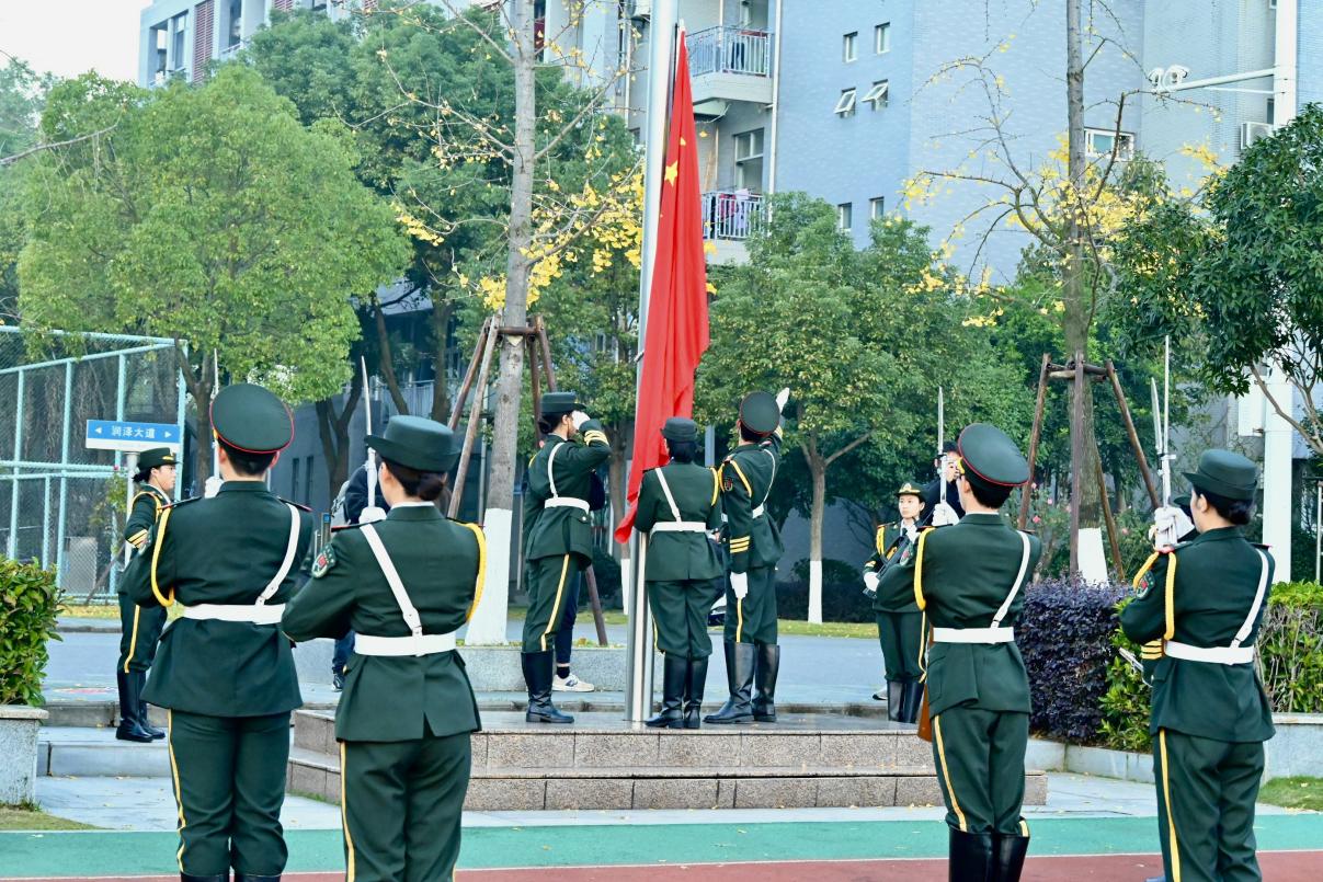 早上七时,升旗仪式正式开始。冬日晨曦下,国旗护卫队在国歌奏唱声中护送五星红旗冉冉升起。在场师生肃立注视国旗飘扬,齐唱国歌。
