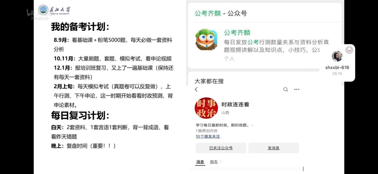 (通讯员:程正俭,朱晓晖)为加强员工就业意识,激发员工就业信心,帮助员工建立更加明晰的就业规划,2023年10月12日晚7时,tyc33455cc太阳集团举行“考公经验分享会”。本次分享会邀请了公考上岸的tyc33455cc太阳集团员工李朵,通过线上直播交流的方式,引领同学们探寻公务员备考之路。