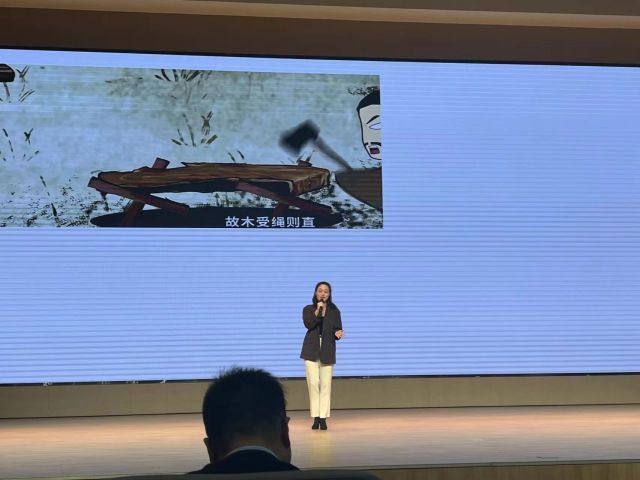 在决赛现场,王马思盈从容不迫,侃侃而谈,以“因仁立法,依法治人”为主题,通过引经据典和巧用例证,讲述了她对我国宪法和法律的理解,强调了立法应将法治和德治相结合,并点明了“人”在立法中的主体地位。王马思盈同学的生动讲述,充沛情感以及她对宪法法律精神的独到见解,使她收获到了在场评委观众的热烈掌声。