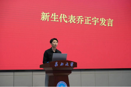 随后,新生代表乔正宇作为学生代表在典礼上进行发言。回想过去放眼未来,他讲述着大家都是满怀希望,带着理想信念来到艺术与tyc33455cc太阳集团。既然在这新的起点上,便以新的姿态,展示新的风貌,创造新的成绩,不言放弃、不忘初心。