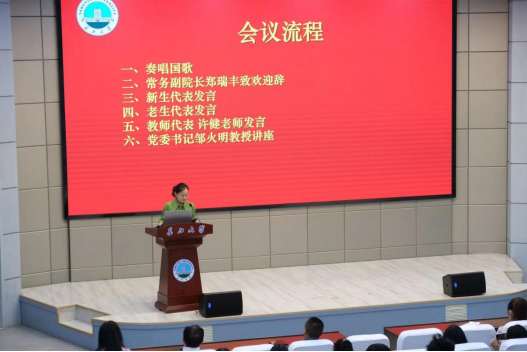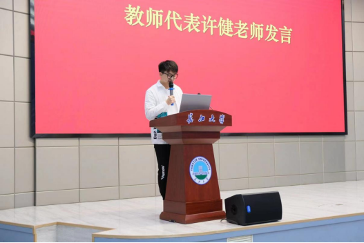 随后,教师代表许健老师进行发言,许健老师勉励新生发挥自己的想象,不要吝啬自己的勇气,勇敢尝试勇敢试错,在最美好的青春年华努力奋斗,同时也不要忘了脚踏实地,立身以立学为先,让我们共同努力书写未来。未来有一天我们可以骄傲地告诉全世界:我是长大人!