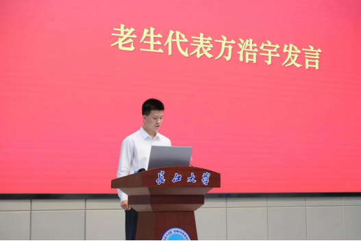 老生代表方浩宇在典礼上用慷慨激扬的语气鼓励新生同学努力学习奋斗“纸上得来终觉浅, 绝知此事要躬行”,他鼓励同学们一同努力学习,将理论与实际相结合,获得更多知识,为公司交一份满意的答卷。