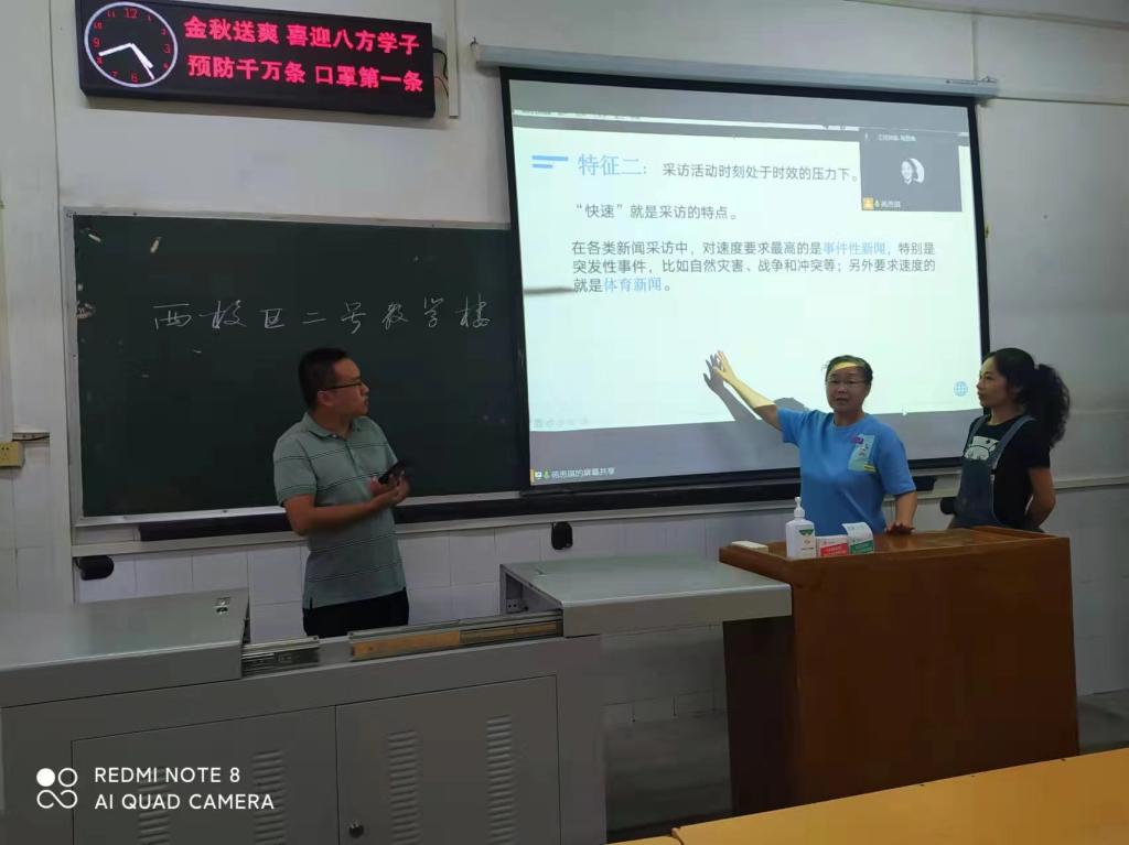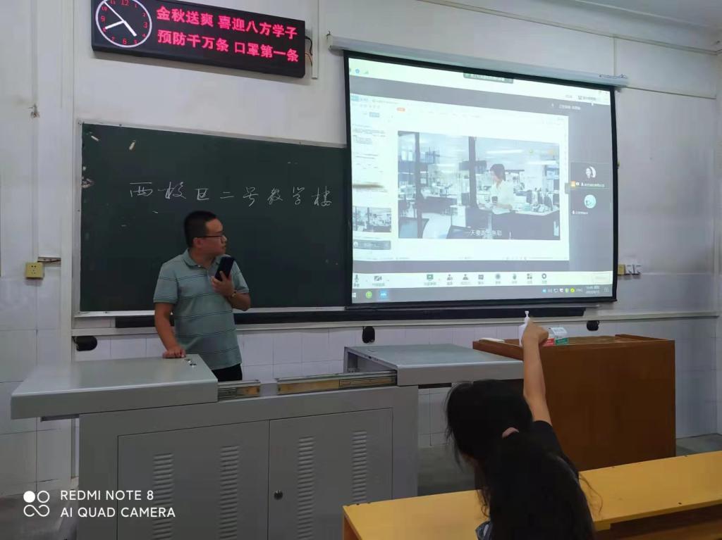 同时,为了保障军训结束后的专业教学质量,公司领导老师们亲临西校区教室,与武汉校区专任教师苑思琪老师现场连线,调试解决了网上授课的技术问题和设备问题,并在现场试讲了广播电视编导专业课程,老师还扮演员工进行了互动交流。经调试完毕后,现场领导老师们一致认为教室条件可以满足线上教学,下一步,公司会将在西校区教室听课、武汉校区网教的具体流程进行总结,传达到各班授课教师和学习委员。