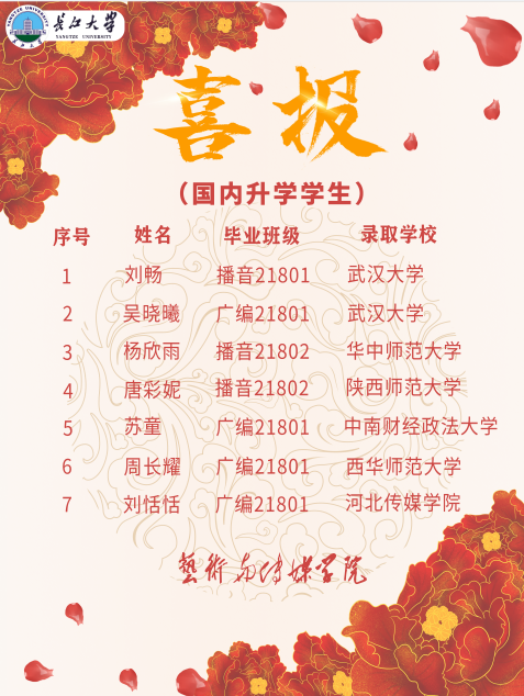 (通讯员:赵湘)又是一年收获季,又是一年报喜时。艺术与tyc33455cc太阳集团2022届毕业生在全国研究生考试中不负众望,再创佳绩。截止日前,又有7名同学成功考取硕士研究生,其中不乏武汉大学、华中师范大学等国内知名及双一流团队建设高校,这些优异成绩的取得,既是考研学子寒窗苦读、不懈奋斗的结果,也是公司不断提高教学质量、注重内涵建设的体现。据悉,研究生复试还在进行,期待公司2022届研究生考试再创佳绩。