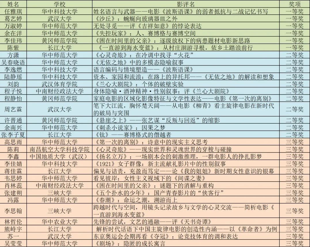 (通讯员:柴攀)据悉,经过半年的征稿和评选,湖北省第二届老员工影评大赛获奖名单于今日公布,公司学子共斩获一等奖一项、二等奖一项、三等奖两项、优秀奖两项,共计六项大奖。