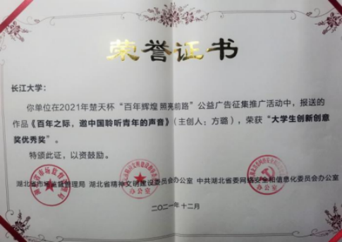 (通讯员:肖淳)据悉,近日公司方璐同学喜获2021年楚天杯“百年辉煌 照亮前路”公益广告征集推广活动老员工创新创意奖优秀奖。