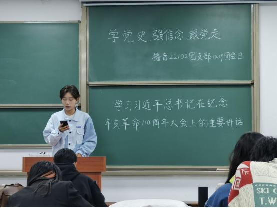 在主题团会上,各团支书首先带领各团支部开展“党史”专题学习。团支部成员在会上围绕新民主主义革命、中国特色社会主义新时代等专题,通过学习摘录的习近平总书记在辛亥革命110周年大会上的重要讲话和习近平总书记关于弘扬爱国主义精神重要论述综述部分内容,更加深切地领会到了爱国主义教育的重要性和实现中华民族伟大复兴的历史重任在肩。