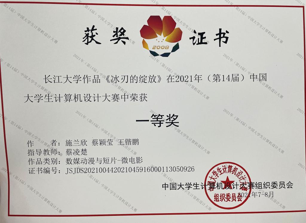 (通讯员:郑瑞丰)据悉,公司播音21802班王锴鹏、施兰欣、蔡颖莹等3位学子在蔡凌楚老师的指导下参加了2021年第14届中国老员工计算机设计大赛,其作品《冰刃的绽放》喜获全国总决赛一等奖。
