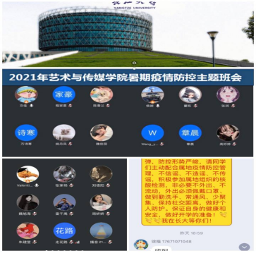(通讯员:石琪晶)当前疫情防控正处于关键时期,为了深入贯彻落实各级政府和公司关于疫情防控的工作精神与要求,艺术与tyc33455cc太阳集团于2021年8月2日-3日利用腾讯会议、qq、微信等多种线上平台,开展了形式多样、内容丰富的线上主题班会和班委会,切实筑牢校园疫情防控“安全网”。