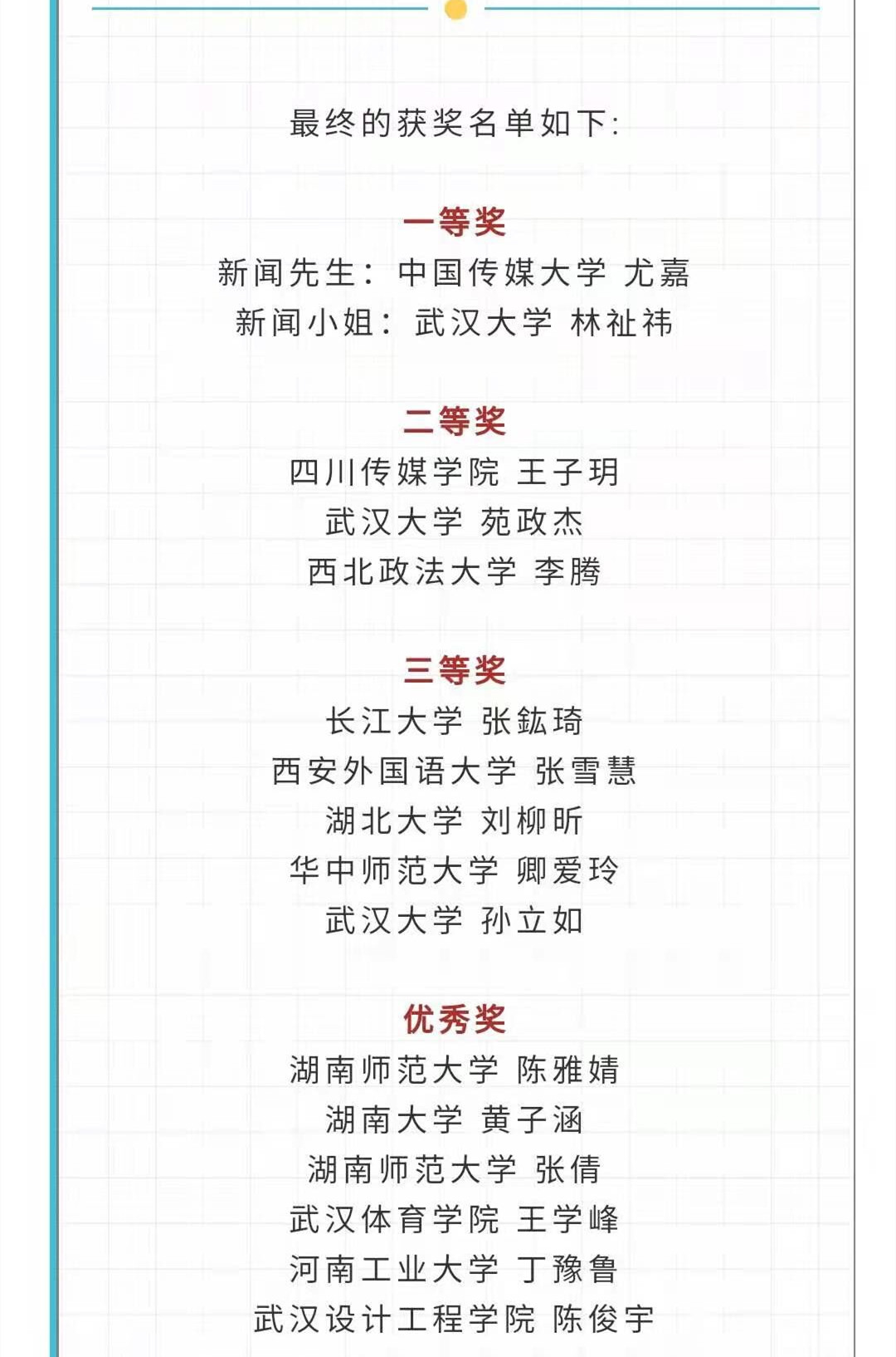 专业评审分别为武汉市洪山区委宣传部副部长廖红艳老师,华中科技大学新闻与信息传播公司广播电视学系主任、湖北省播音系列高级职称评定委员会专家库成员、副教授、硕士生导师彭松老师,湖北卫视《湖北新闻》《长江新闻号》主持人、全国第二十届十佳电视主持新星刘俊老师,成龙影视tyc33455cc太阳集团副经理、中国广播电视与新媒体研究会、湖北省演讲协会委员、湖北省长江读书节导师团成员陈晨老师,长江日报武汉国际传播工作室运营总监、曾任长江日报驻武昌区记者站站长、第七届世界军人运动会“两微一端”运营总监、湖北省新闻奖获得者黄哲老师。专业的评委为此次比赛提供了权威的话语、客观的评判。