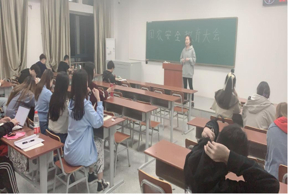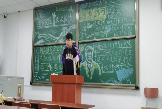 各班在班会前组织员工在黑板上办下国家安全教育相关主题海报。在班会过程中,班级挑选出优秀成员,为大家讲讲学习国家安全教育知识的心得。