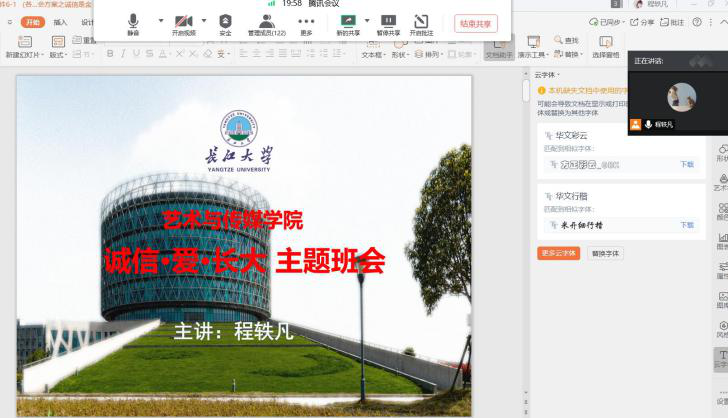 (通讯员:程轶凡)当前,鉴于疫情防控常态化,为加强疫情期间的纪律安全和在线考试的考风考纪教育,引导同学们努力学习、诚信做人,2020年6月8日-12日,艺术与tyc33455cc太阳集团辅导员围绕属地疫情防控指挥部的相关规定、个人卫生防护、人员流动报备、健康信息填报、考试诚信承诺、安全教育等重点工作,利用腾讯会议、腾讯课堂、qq、微信等多种线上平台,开展了形式多样、内容丰富的诚信教育主题活动。