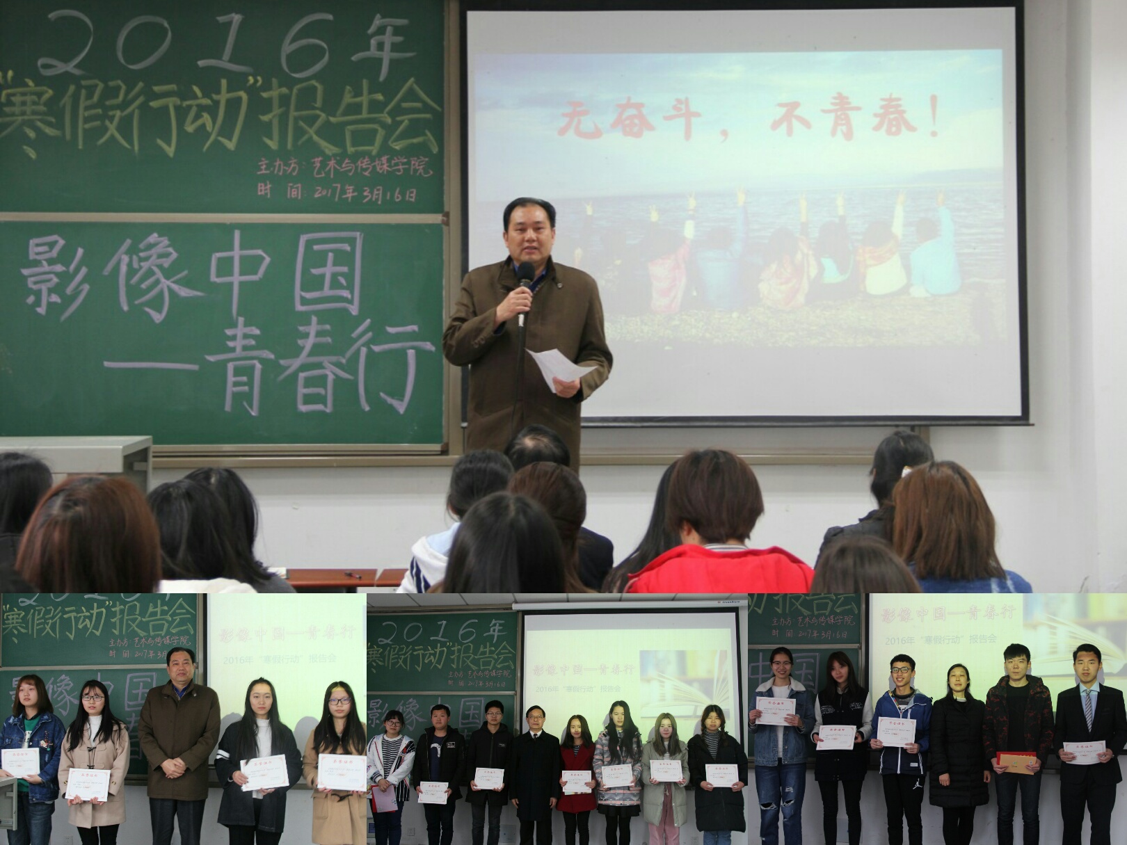 (通讯员 谢言 汪思 汪晓昊/文 吕楠楠/摄)室外寒意料峭,室内春意盎然!3月16日上午,艺术与tyc33455cc太阳集团在武教A104举行了以“影像中国――青春行”为主题的 “寒假行动”报告会。出席本次大会的有公司党总支书记邹火明教授、常务副经理毛道福老师、辅导员饶艳芹老师。