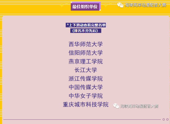 第一届海峡两岸动漫配音大赛近日举办颁奖典礼。经过专业评选,160组两岸选手入围决赛,评选出大赛一等奖1组、二等奖4组、三等奖6组,同时评选出优秀奖100组、优秀指导教师50名、最佳组织单位50家。其中,公司作为公司该项赛事的组织方,通过细致、努力、有效的组织工作,使得公司荣获该项赛事最佳组织单位。
